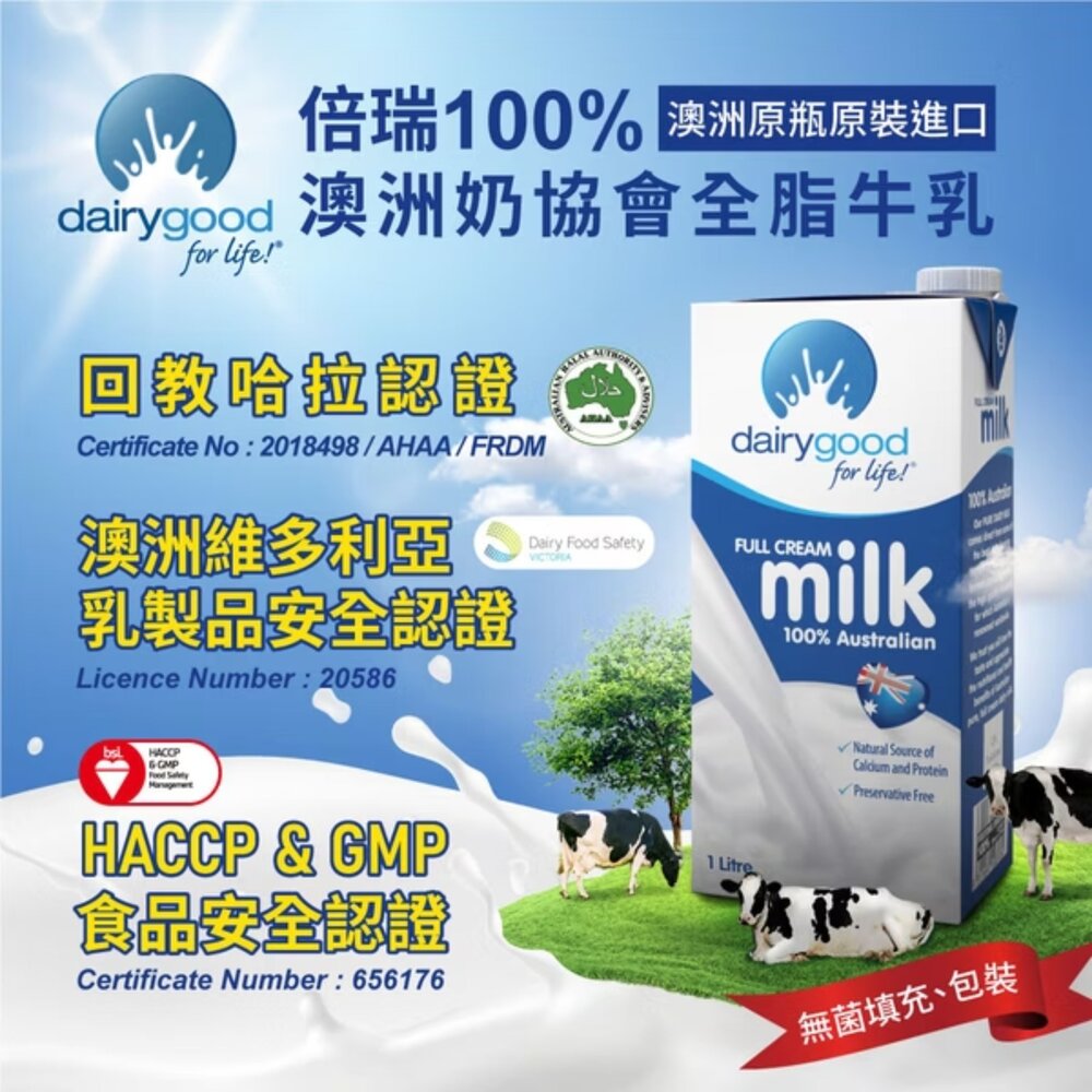 品名:澳洲牛奶協會全脂牛乳-保久乳 成分:100%澳洲全脂鮮乳 ●澳洲原裝原瓶進口 ●2秒高溫滅菌 無菌包裝 ●HACCP & GMP 食品安全認證 ●伊斯蘭教-哈拉證書 ●澳洲維多利亞乳製品安全證明