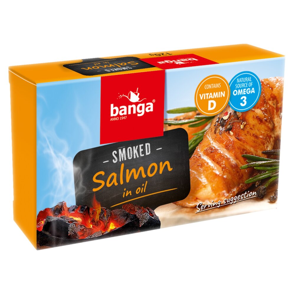 內容物: Banga煙燻油漬鮭魚 淨重:120g/固形量:72g Banga煙燻油漬鮭魚 -檸檬風味 淨重:120g/固形量:84g